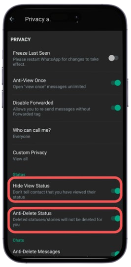 GB WhatsApp offers enhanced privacy controls, allowing users to manage chats for individuals, groups, and broadcasts. You can hide blue ticks, typing status, recording indicators, and online activity for better control.